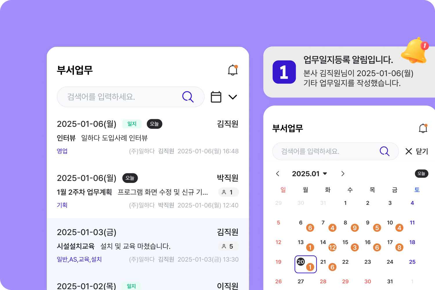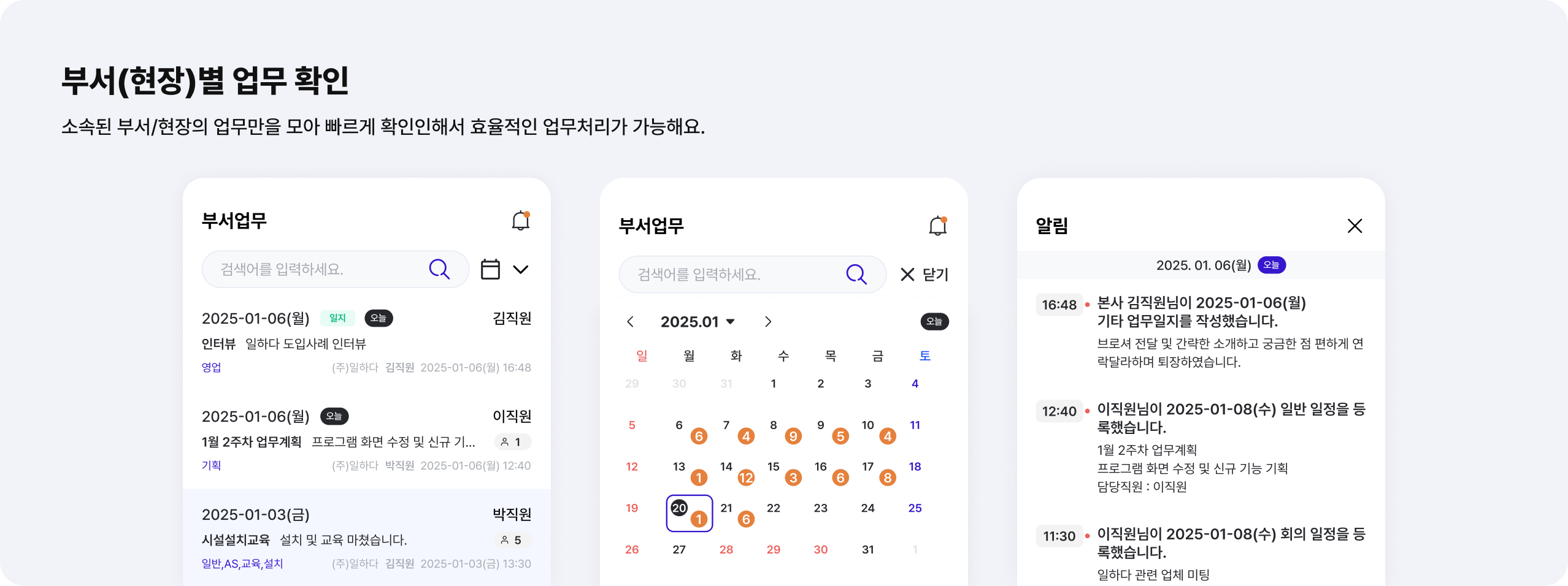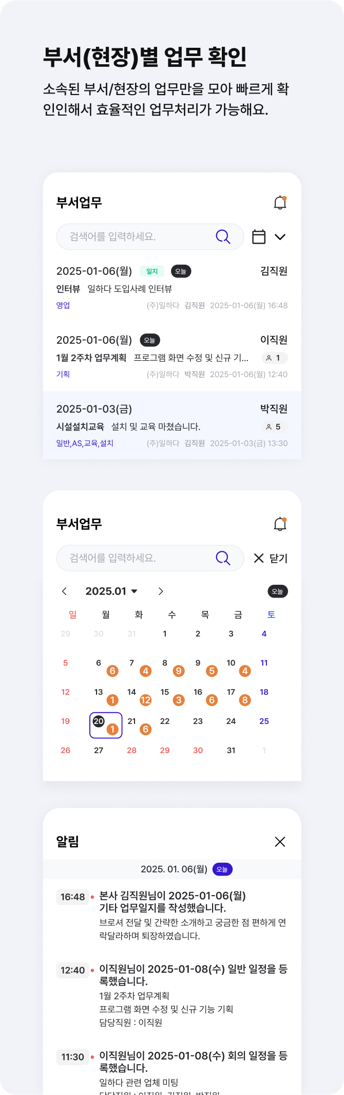 소속된 부서와 현장의 모든 업무일지와 업무스케줄을 확인할 수 있어, 업무 관리와 처리가 더욱 효율적이에요.