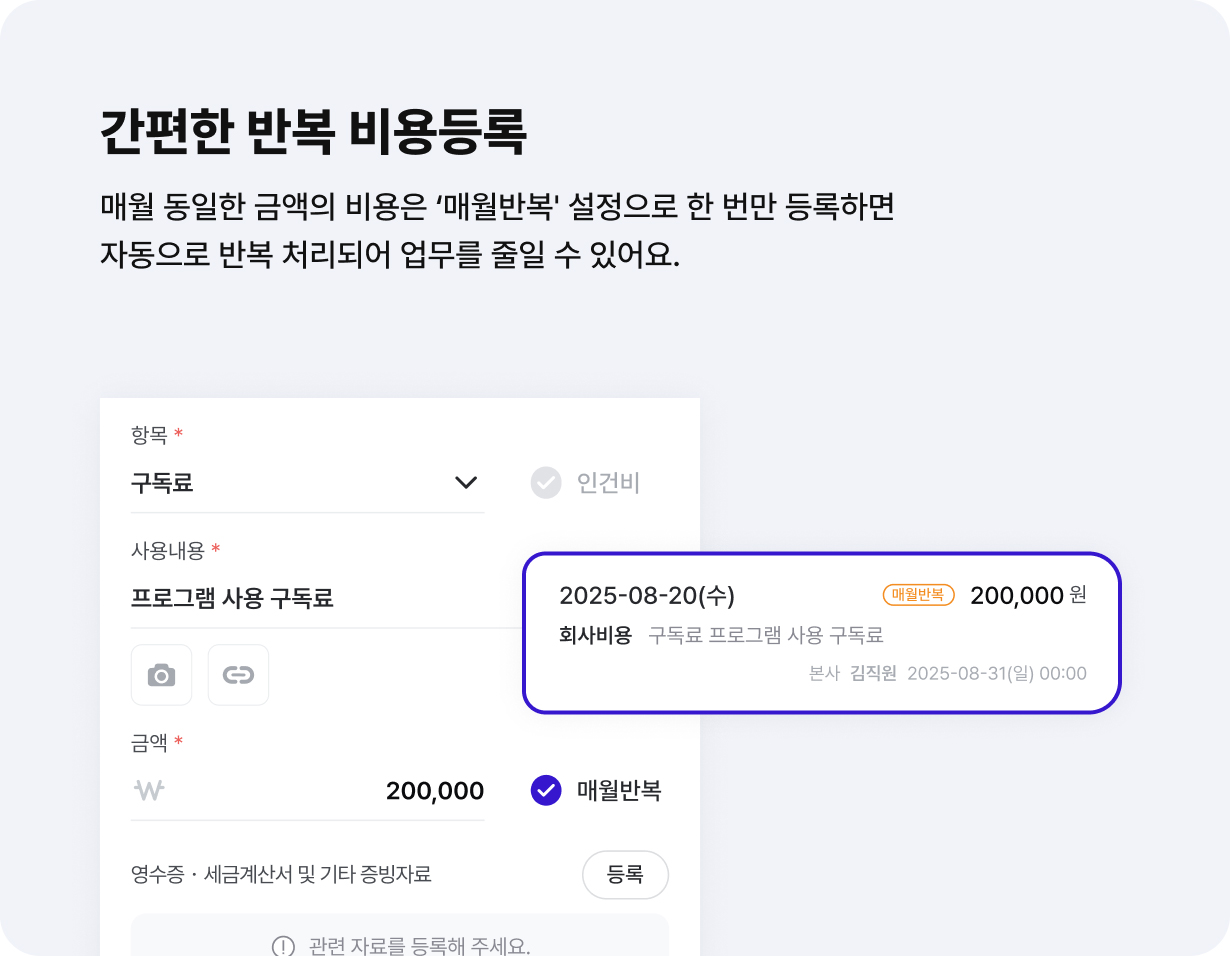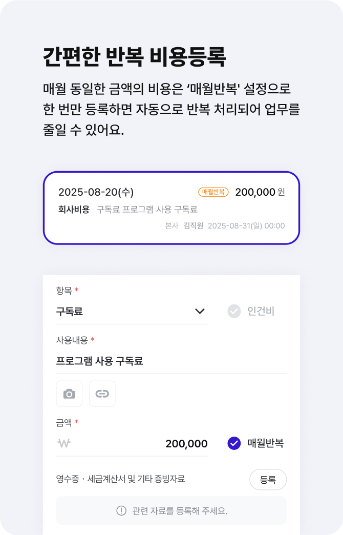 직원이 등록한 지급품의와 지출증빙을 통합 관리하고, 임대료 등 매월 발생하는 고정비를 등록하여 체계적인 비용관리가 가능해요.