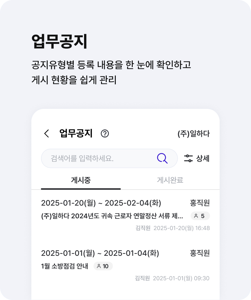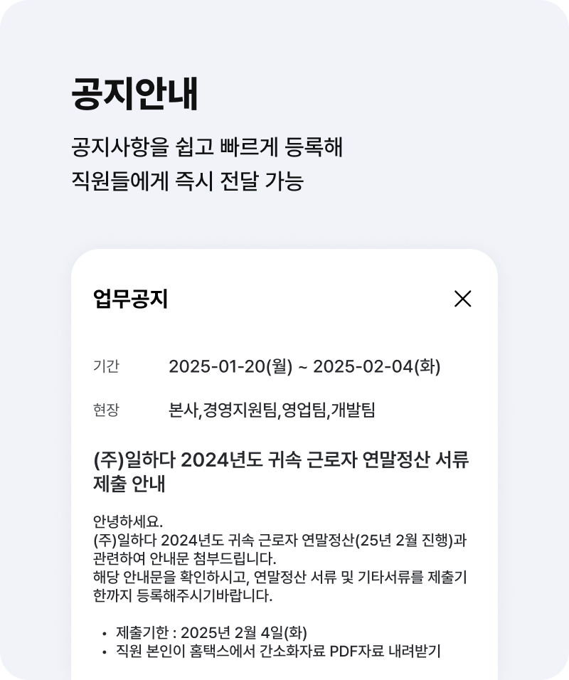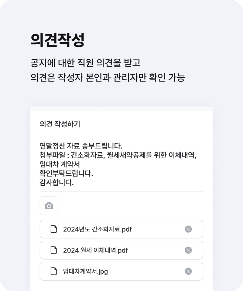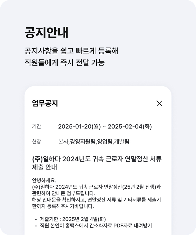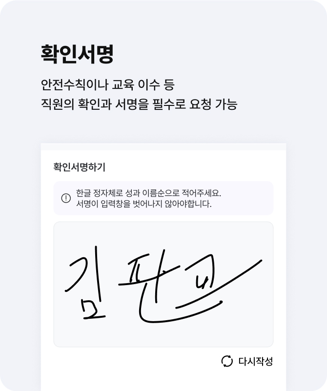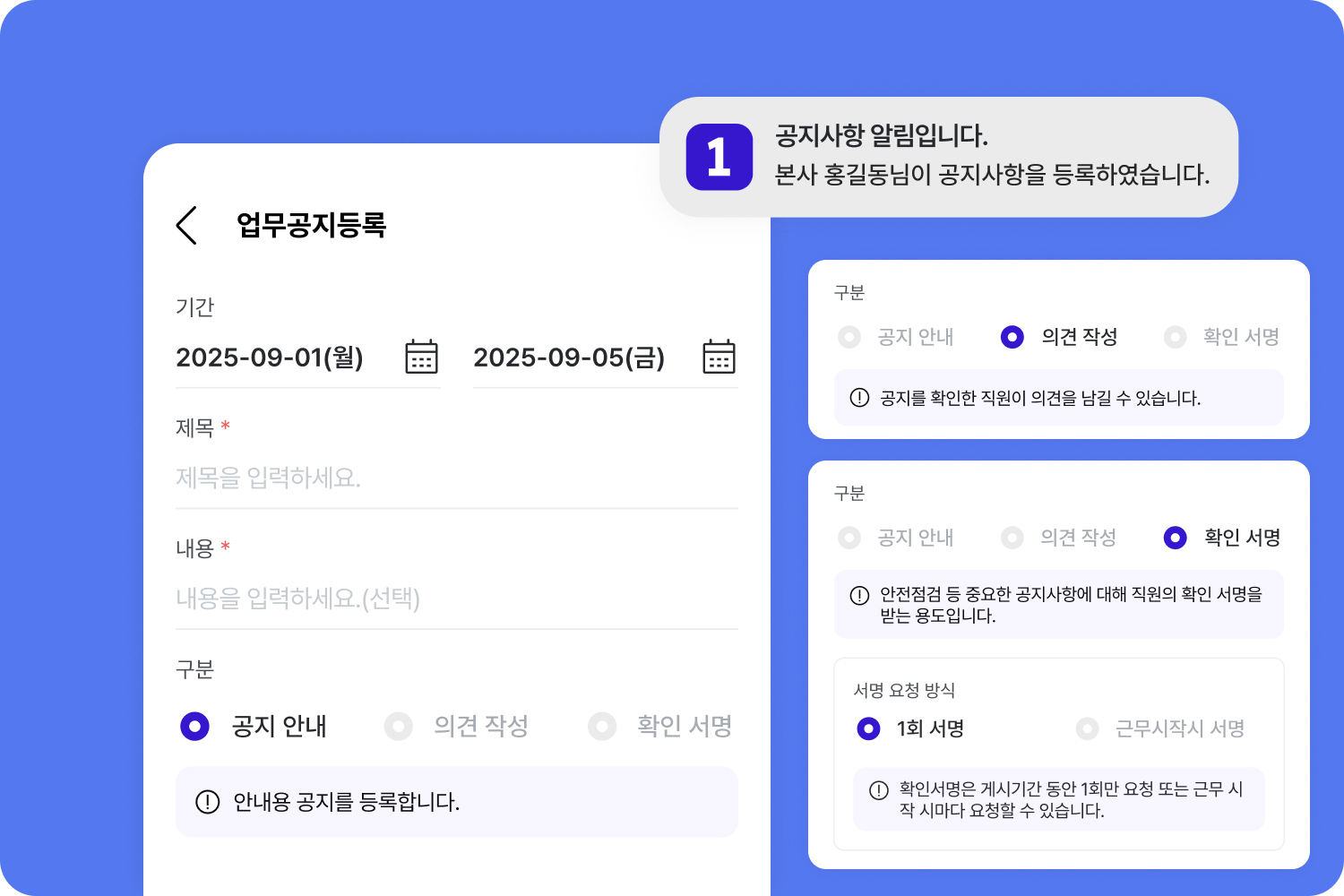단순한 공지 등록을 넘어 직원 의견 수집과 확인서명 관리까지
